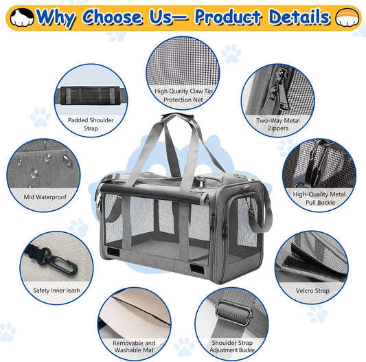 Premium Cat Carrier Set of 3 - Airline Approved, Breathable Mesh Design, Easy-Clean Dog Carrier for Small Pets with Foldable Bowl & Nameplate (Grey)